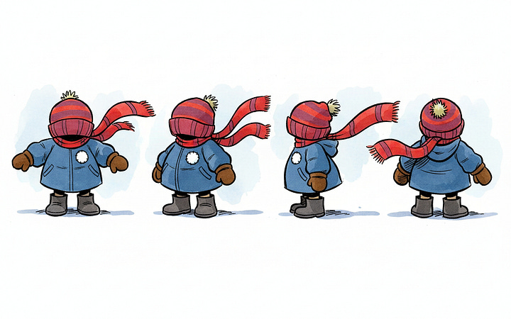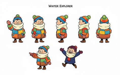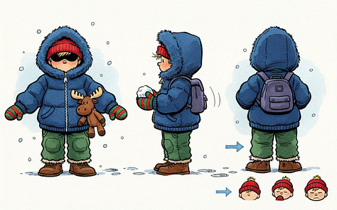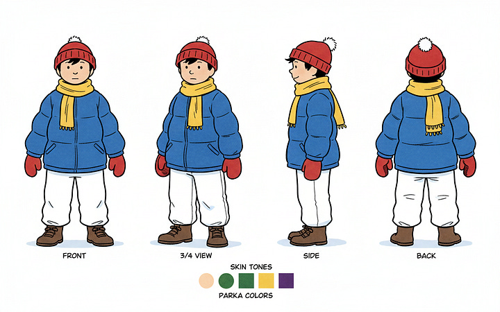 I tried a few different tactics to brainstorm how some characters might differ: height, weight, skin color, hair color, different kinds of hats, jackets and other winter gear. The tactics that got the LLM brainstorming effectively were very similar to the ones I’d built into Imaginator.