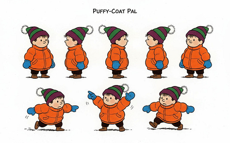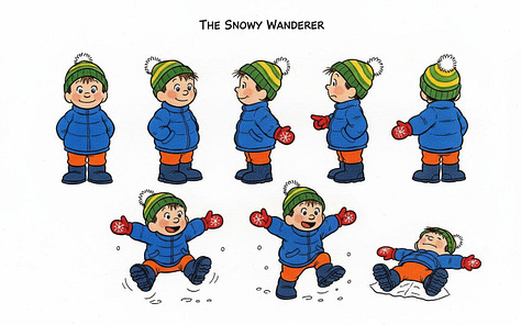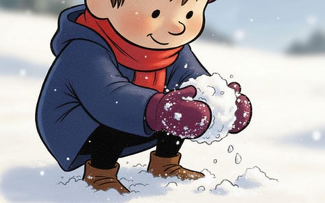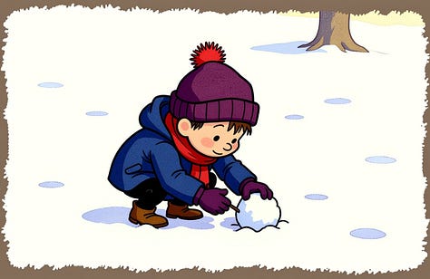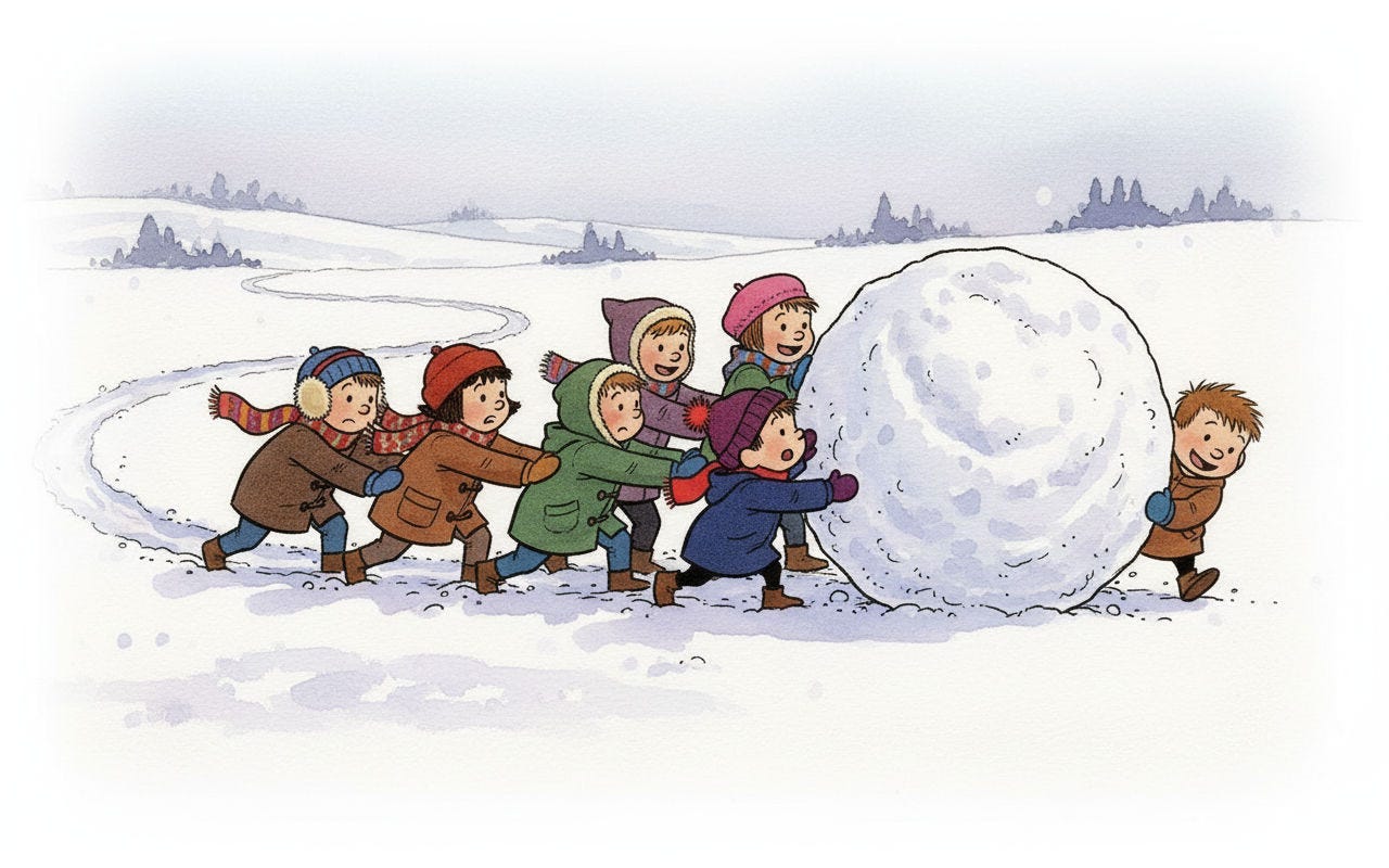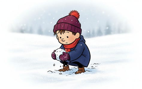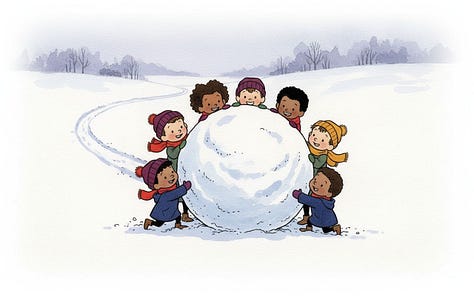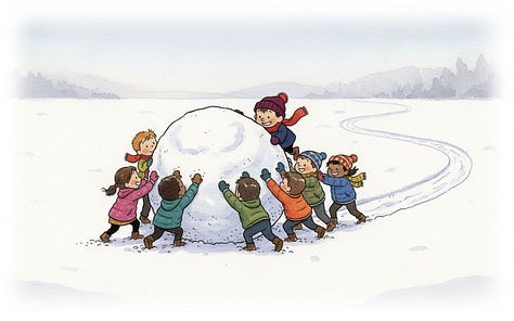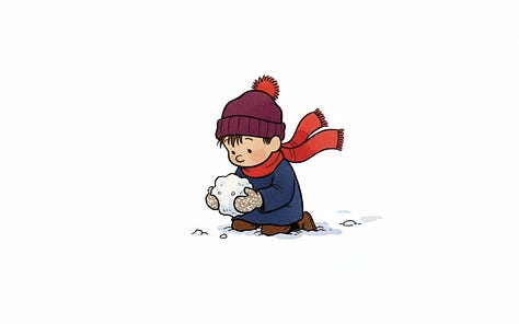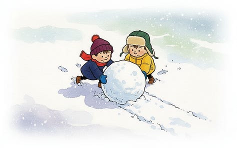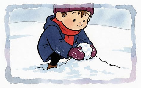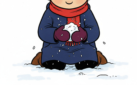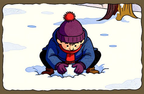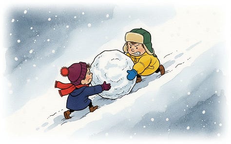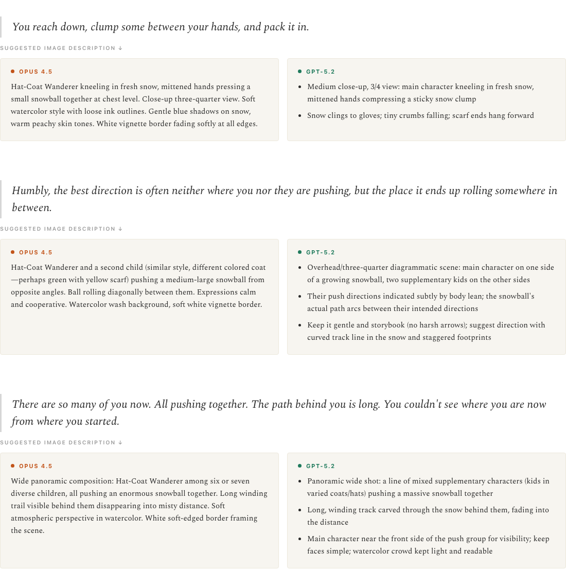 For the line “Humbly, the best direction is often neither where you nor they are pushing, but the place it ends up rolling somewhere in between,” Nano-banana really wanted to put the characters on opposite sides of the snowball, but the line calls for characters pushing at slightly different angles. Their combined vector needs to still be going somewhere for the story to make sense.
