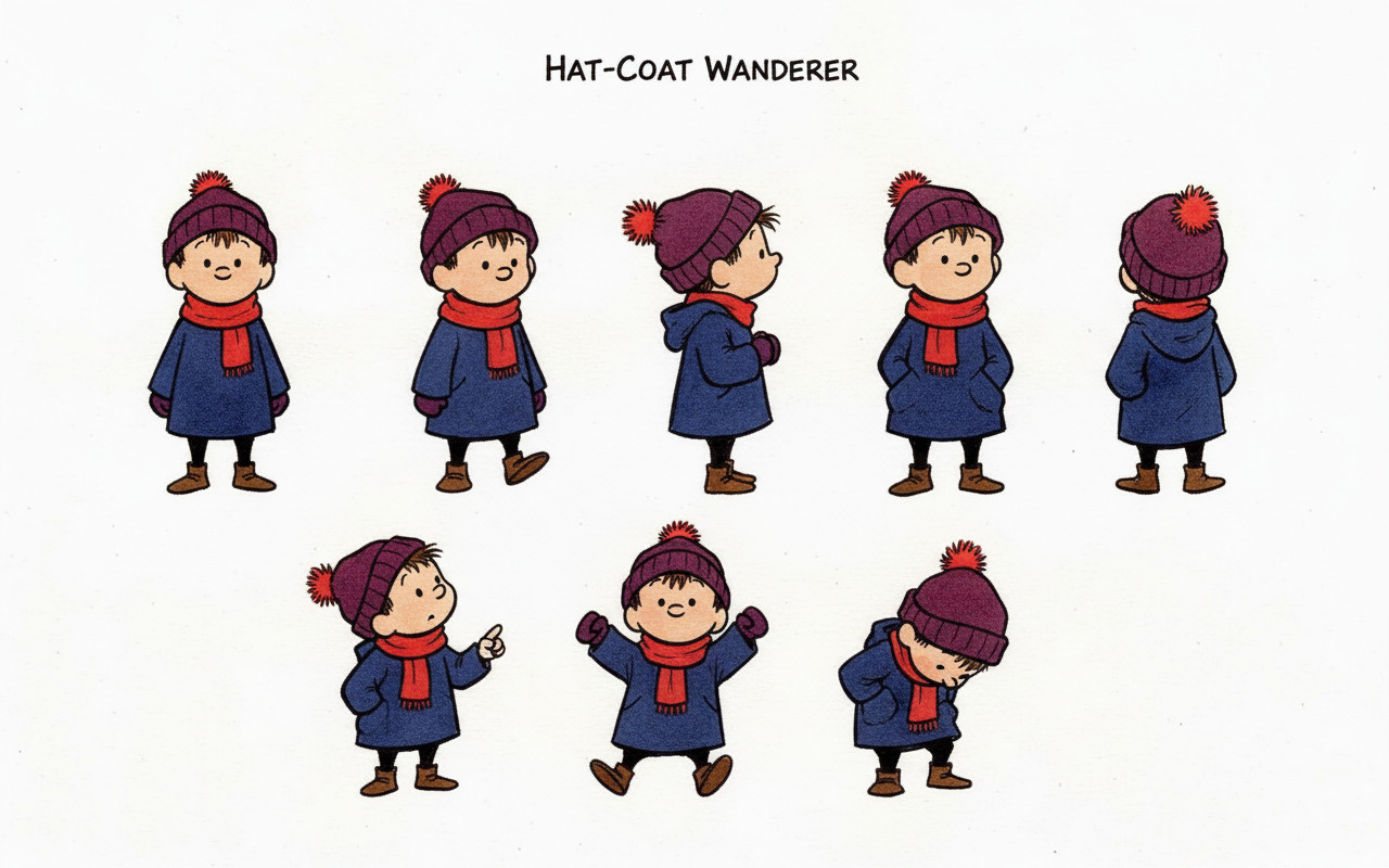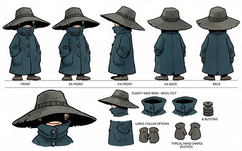 In the first round of character generations I ended up with this which I liked quite a bit. It became the canonical reference which Nano-banana dubbed Hat-coat Wanderer.